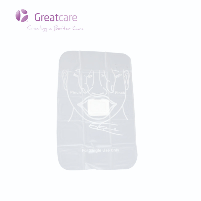 Écran facial CPR à usage unique par une personne formée. Peut être utilisé sur des adultes, des enfants ou des nourrissons pour protéger le sauveteur pendant la RCR. Le masque facial Greatcare CPR a été produit en Chine.